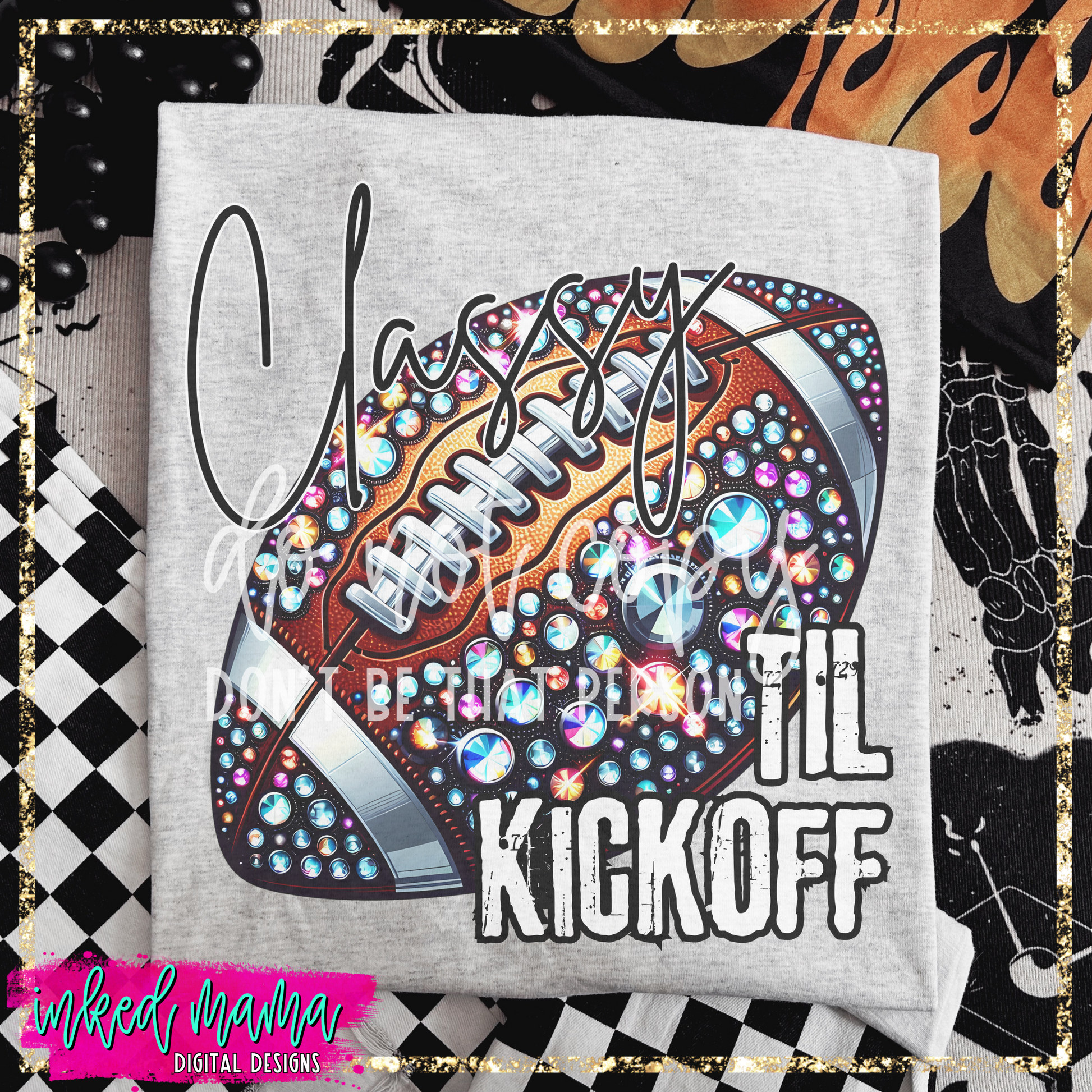 Get ready for next big game in style with our "Classy Til Kickoff" sublimated apparel. Perfect for football fans and cheerleaders alike!