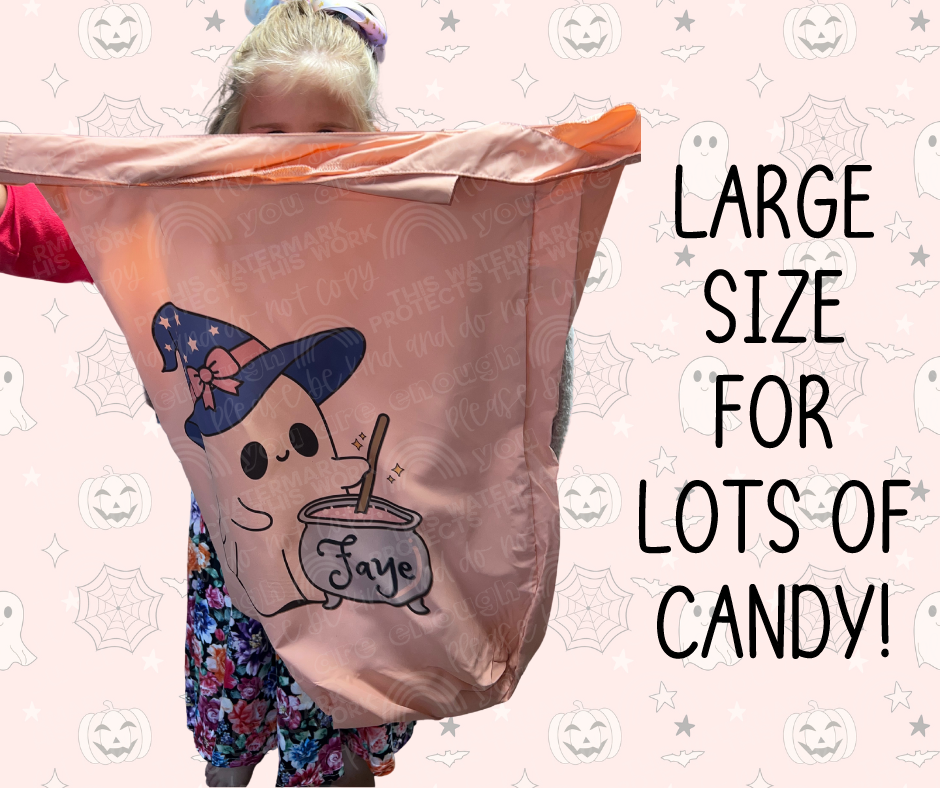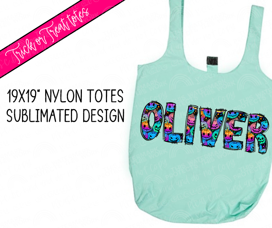 19x19" Nylon Tote Bags can be customized with child's name and folded for easy storage! This size is perfect for holding lots of candy and comes with two straps for easy carrying!