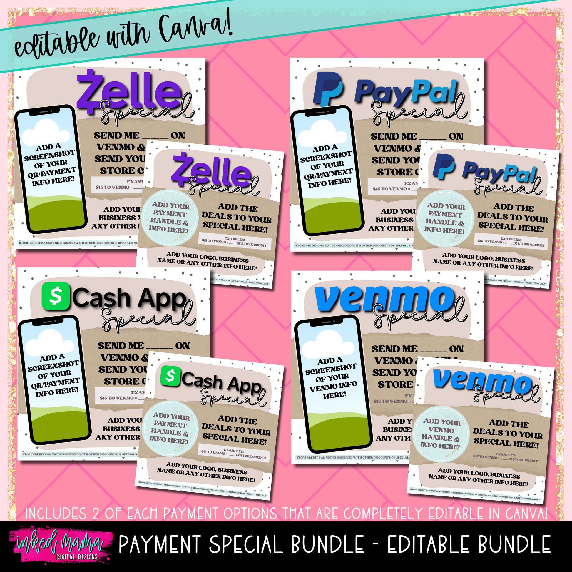 Includes 2 graphics of each payment type that you can edit the colors, font and elements to your liking!