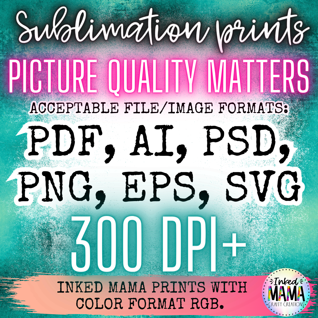 **SUBLIMATION FUN FACTS TO KNOW: Inked Mama's sub printer DOES NOT print white. Any white in your images will be void of ink and when pressed will be the color of whatever substrate (product) you are pressing on. Example: if pressing on a light grey shirt, any white in your design, will be light grey (the shirt color) when pressed. Sublimation works best on light colors, that are polycoated or a high count polyester. The higher the poly count, the brighter your image will be. If you are using a cotton blend, you may see fading in your design. That is due to the cotton fibers in the material. Think of it as a highlight writing on black paper, it will work but you won't see it!